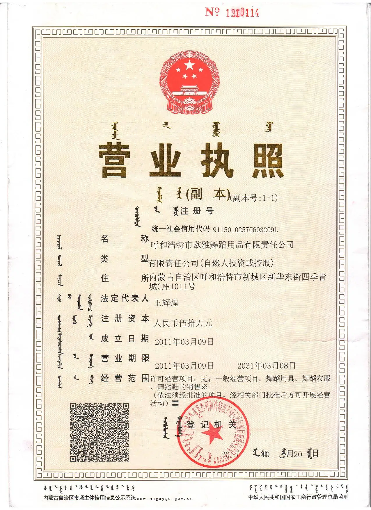 Registered address : No. 1011, Building C, Sijiqingcheng, Xinhua East Street, Xincheng District, Hohhot City Hohhot Inner Mongolia China